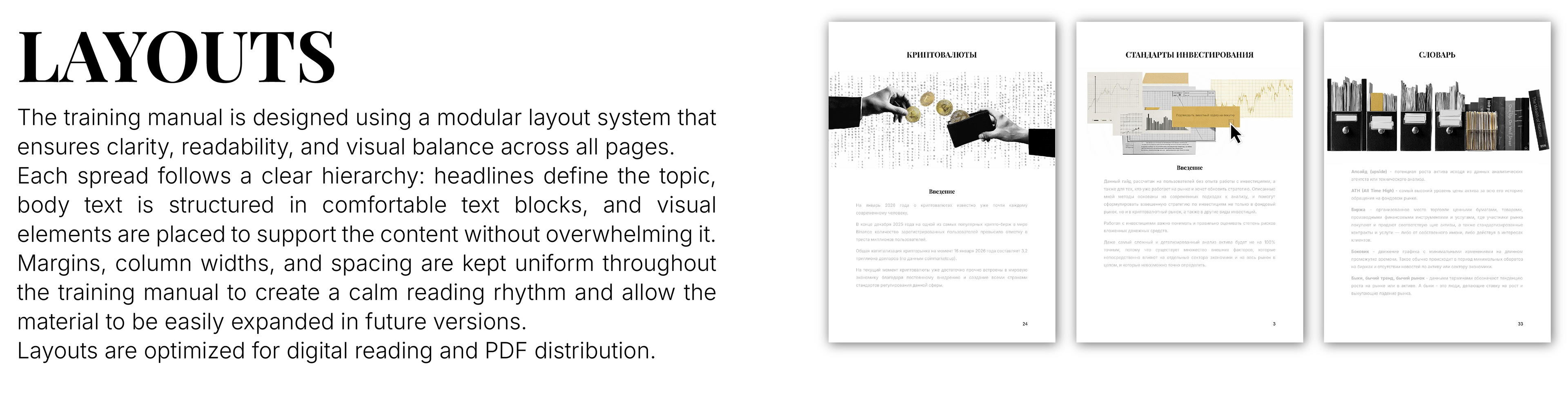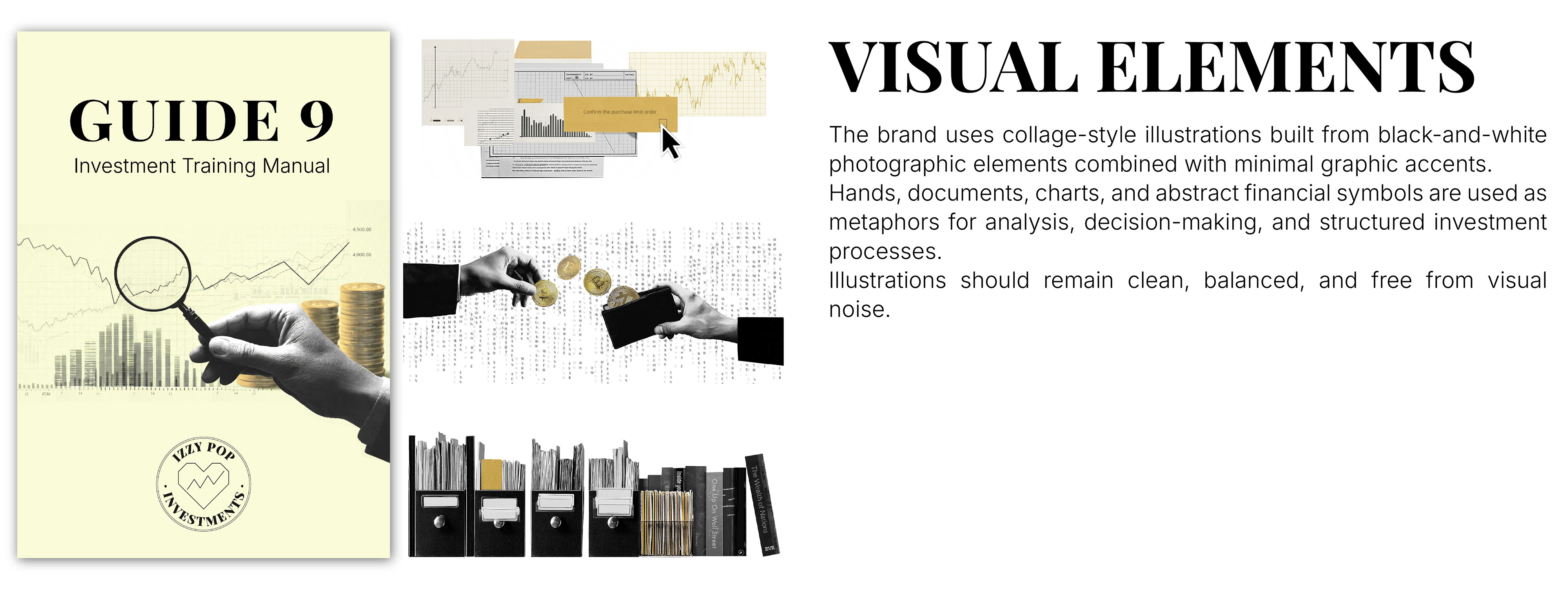 In this project, I worked on the full development of a visual identity system and the editorial layout of an investment training manual for an educational investment project. The work included logo refinement, brand typography, color system, collage-style illustrations, and a structured layout designed for clarity and long-term use.